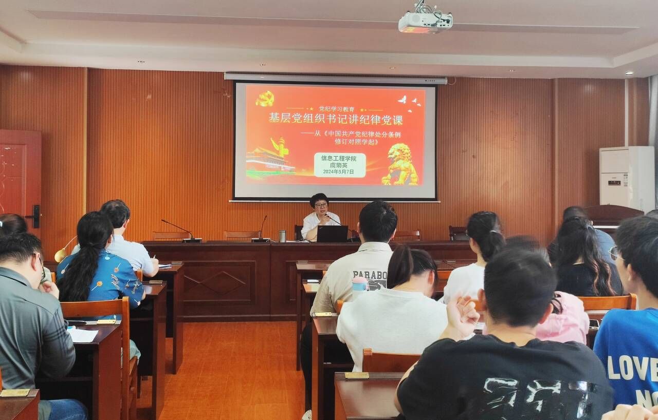 5月7日,公司党委书记虞菊英在信工楼A208会议室以“从《中国共产党纪律处分条例》修订对照学起”为题上纪律教育专题党课,全体师生党员参加学习。党课上,虞菊英带领党员们学习了习近平总书记关于党的纪律教育的重要论述,深入解读了学习《中国共产党纪律处分条例》的重要意义,通过《中国共产党纪律处分条例》修订条文对照表的解读,并结合实际案例为全体党员上了一堂生动的纪律教育课,帮助大家更加准确把握新修订的《条例》的主旨要义和实践要求,进一步增强纪律意识和规矩意识。
