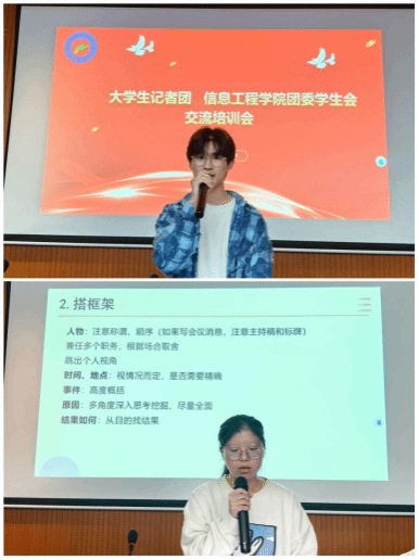 校老员工记者团新闻采编部副部长李思佳结合已有的校园新闻稿件的实际案例,从新闻写作的重要性、新闻六大关键要素、新闻框架的搭建和新闻内容的撰写等方面讲解了校园新闻写作的方法与技巧,并提出新闻撰写要提高政治敏感性,要多思多看多写。