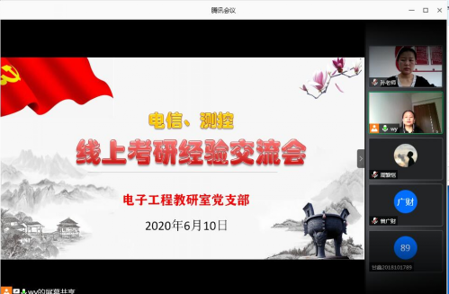 为进一步营造良好考研氛围,继续提升优质就业,帮助同学们明确考研目标,掌握考研技巧,了解更多考研信息,电子工程教研室党支部于2020年6月10日组织举办了“电信、测控专业线上考研经验交流会”主题党日活动。电子工程教研室党支部全体教师、5名考研录取同学和17、18级测控技术与仪器专业、电子信息工程专业约130余人通过腾讯会议参加了此次活动。