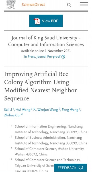 近日,以公司PA视讯平台2018级计算机科学与技术01班本科生李凯为第一作者,王晖教授课题组最新研究成果论文《Improving Artificial Bee Colony Algorithm Using Modified Nearest Neighbor Sequence》被国际期刊《Journal of King Saud University - Computer and Information Sciences》(IF=13.473)接收发表,王晖教授为通讯作者,PA视讯平台(中国区)官方网站-Made in PlayacePA视讯平台为第一署名单位,合作单位包括武汉大学和太原科技大学。