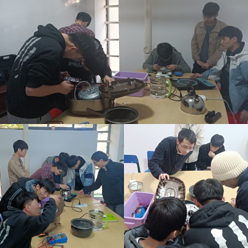 活动现场,院第三员工党支部成员与志愿者组成三支义务维修队,同学们凭借自己所学专业知识与本领,将电路理论知识与电焊实践经验投入到家电维修活动中。从教工家属小区收集来的电器,经过维修员们拆解维修、更换零件、清洁保养后焕然一新,大部分家电维修成功,可重新投入使用。