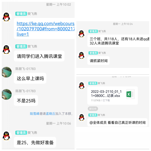樊老师将授课内容分为三个部分:课前知识传递、课中知识内化以及课后知识基础巩固等,并通过将需要优化和调整内容回馈到课前、课中和课后各相应的环节中,使其成为一个具有持续优化的质量管控闭环。她及时联系班委建立了班级QQ群和腾讯课堂,将相关学习资料上传班级群供员工自主学习,并辅以中国大学慕课及学堂在线等学习网站的网课资源,尽最大努力确保线上教学与线下课堂的并步、同质、等效。