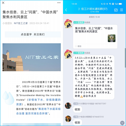 “集水信息、云上‘问渠’,‘中国水周’聚焦水利风景区”主题线上宣传系列活动的开展,使全院师生深深感受到水文化的魅力,同时提高了全院师生对水文化知识的认知,促进了同学们形成保护水源水质的理论,养成节约用水行为规范。为共同助力建设高水平水利电力特色大学提供丰富的精神支撑和有力的文化保障,以优异成绩迎接党的二十大胜利召开。(文/阮晶晶 刘岚 图/汪力)