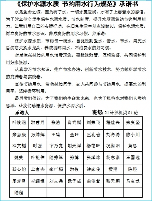 班级签署《保护水源水质 节约用水行为规范》承诺书