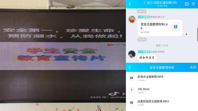 本次主题教育活动在线下于各楼栋的电子屏幕播放防溺水教育短片,线上在安全委员群与班长群中分享安全教育知识资料进行广泛宣传,以达到防溺水安全知识全院覆盖,人人知晓。同时,各班级积极召开线上防溺水主题班会,班主任和班委协同组织,结合PPT与教育影片内容,列举出许多老员工意外溺水的惨痛事故,敲响了同学们防溺水的警钟,让同学们深刻认识到防溺水的重要性,并带领同学们学习了解防溺水的基本常识、自救与救人的正确方法,最后动员同学们朗读防溺水“六不准”与“七不要”。