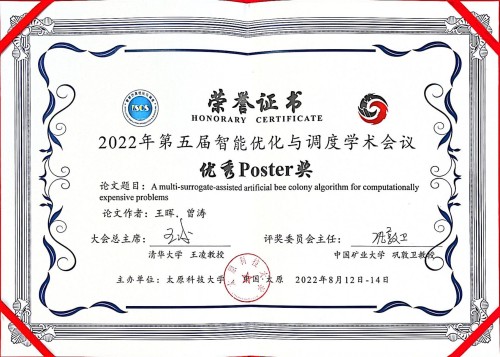 会上,公司王晖教授与其指导的研究生曾涛所撰写的论文《A multi-surrogate-assisted artificial bee colony algorithm for computationally expensive problems》,获得了“优秀Poster”奖。