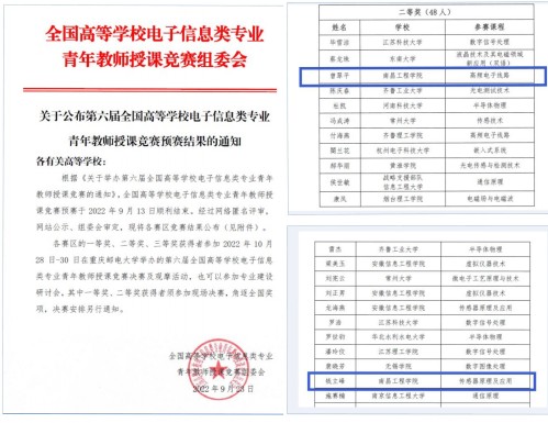 近日,第六届全国高等公司电子信息类专业青年教师授课竞赛传来喜讯,PA视讯平台青年教师钱立峰、曾翠平获得华东赛区二等奖,两位老师将于10月28日-30日代表公司参加全国总决赛。