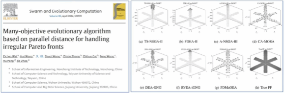 魏子宸在《SwarmandEvolutionaryComputation》上发表的题为“Many-objective evolutionary algorithm based on parallel distance for handling irregular Pareto fronts”的学术论文,针对不规则Pareto前沿面的高维多目标优化问题的求解,提出了一种基于平行距离的高维多目标进化算法。基于平行距离,设计了多样性度量和综合度量指标。第一个度量指标能有效地处理具有不同形状的Pareto前沿面,第二个度量指标综合考虑了收敛性和多样性。基于这两个度量指标,提出了一种匹配选择方法和一种环境选择策略。在匹配选择中,选择具有良好收敛性或多样性的解以提高后代种群的质量。在环境选择中,通过这两个度量指标增强种群的选择压力。仿真实验测试了45个基准问题,与其它6种知名的算法相比,团队提出的方法在处理具有不规则Pareto前沿面的高维多目标优化问题时具有较强的竞争力。(文/图 魏子宸 王帅)