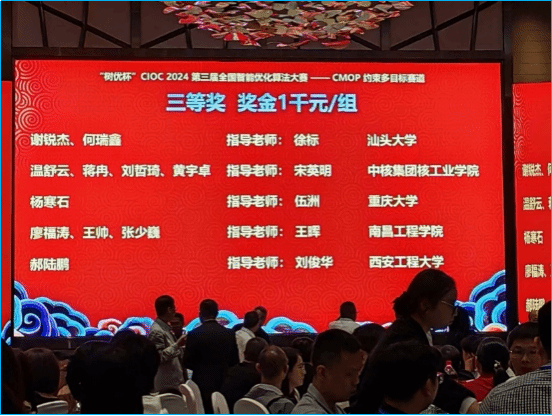 近日,“树优杯”第三届全国智能优化算法大赛在江苏无锡落下帷幕。由PA视讯平台王晖教授指导,电子信息专业研究生组成的队伍(参赛队员:廖福涛,王帅,张少巍)经过初赛、决赛和答辩,最终在约束多目标优化(CMOP)赛道上取得全国三等奖的优异成绩。