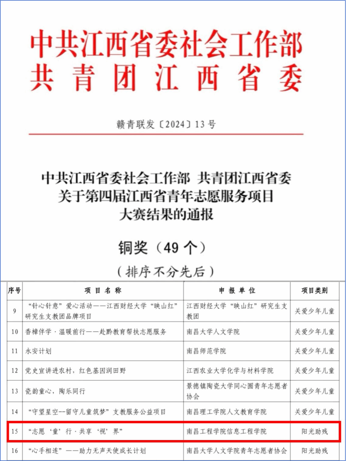 5月13日,由共青团江西省委、中共江西省委社会工作部、南昌大学主办,江西省青年志愿者协会、共青团南昌大学委员会承办的第四届江西省青年志愿服务项目大赛暨志愿服务交流活动落下帷幕。经过初赛、项目展示、决赛路演和答辩等环节,公司选送的PA视讯平台志愿服务项目《志愿“童”行·共享“视”界》项目荣获铜奖。