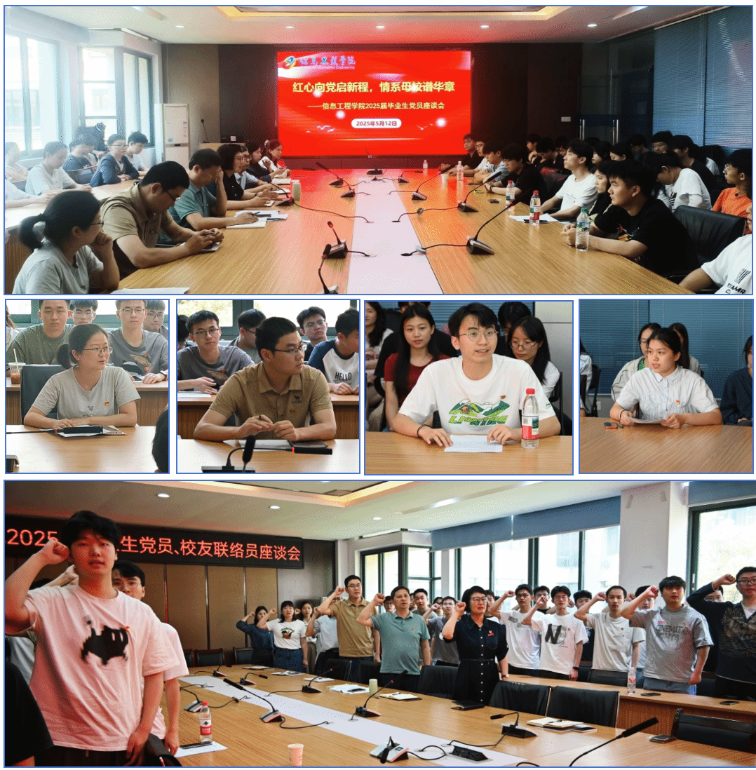 在毕业生党员座谈环节,以“红心向党启新程,情系母校谱华章”为主题,强化毕业生党员党性教育,激励青年党员勇担时代使命。党支部书记代表寄语全体毕业生党员,谨记“自强不息,格物致知”的校训,饮水思源,强化廉洁意识,规矩意识和契约精神,以“强国有我”的担当,在民族复兴的赛道上跑出最好成绩,以实际行动回馈母校。并向毕业生党员提出三点希望:一是坚定政治信仰,做对党忠诚的践行者;二是锤炼过硬本领,做科技报国的实干家;三是常怀感恩之心,做母校精神的传播者。员工党员代表21级电子信息工程刘振宇、21级数据科学与大数据技术夏唯一两名同学分别发言,表示将铭记母校老师的殷殷嘱托,继续保持共产党员底色,不忘初心,勇于担当作为。会上全体党员面向鲜艳的党旗,庄严举起右拳,再次重温了入党誓词。