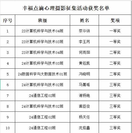 本次活动共收集到30余幅充满温度与创意的摄影作品。参赛作品题材丰富多样,有的记录了校园里温馨的人物互动场景,有的展现了自然美景带来的心灵治愈。每一幅作品都承载着同学们对幸福的独特理解,传递着积极向上的生活态度和温暖人心的力量。评审小组从主题契合度、画面构图、情感表达等多个维度对作品进行了综合打分,最终评选出一等奖2个、二等奖3个、三等奖5个。